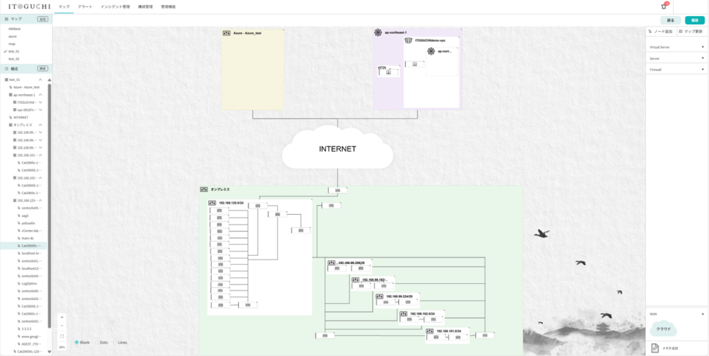 クラウドアカウント連携やセンサーで情報取得し、「自動」でインフラ全体のMAPを生成し描画します。
