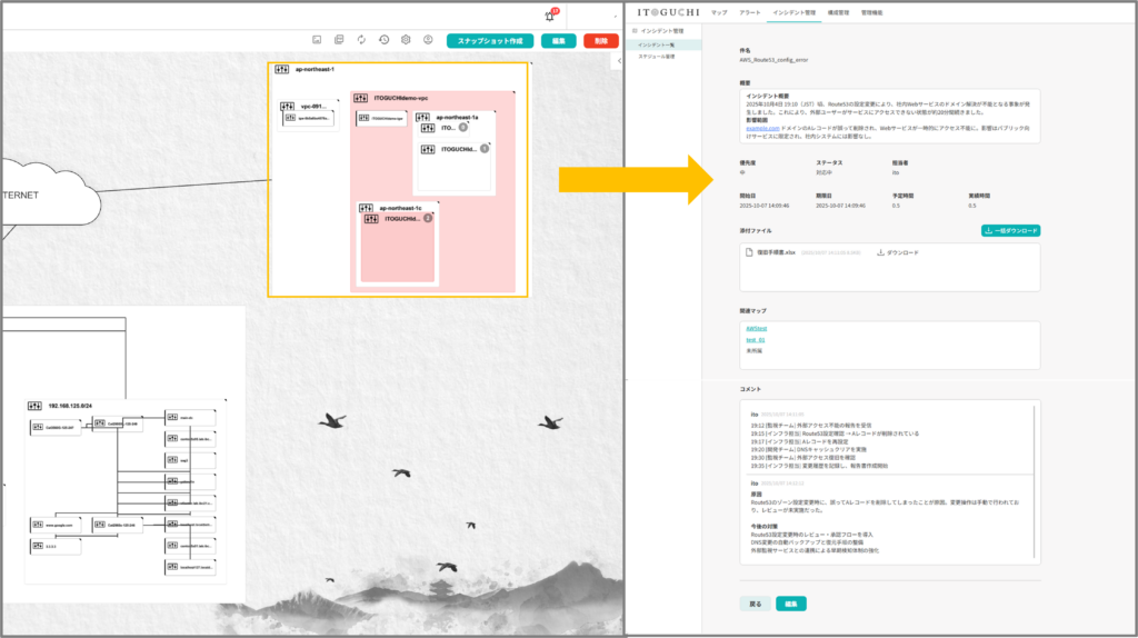 「ITOGUCHI」は、これらの声に真正面から向き合い、構成情報の自動検知・自動描画・常時最新化を実現します。障害発生時には、影響範囲の即時把握と原因特定を支援し、運用の属人化を防ぎます。