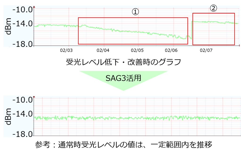 顧客の伝送機器の受光レベルを監視していたところ、正常稼働時は一定のレベルで推移する値が、ある箇所から値が徐々に低下していることが判明した。原因究明のため、 G3で蓄積した過去データから、年間の記録と比較し、グラフ内①のように数日に渡り減少が継続していることが認識できた。この結果から、顧客や回線事業者に問い合わせを実施。伝送機器を確認してもらうことでグラフ内②のように受光レベルの改善が図られた。