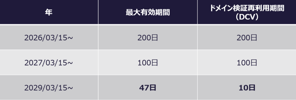 また、これに合わせてドメイン検証再利用期間( DCV )も短縮が進むため、注意が必要です。